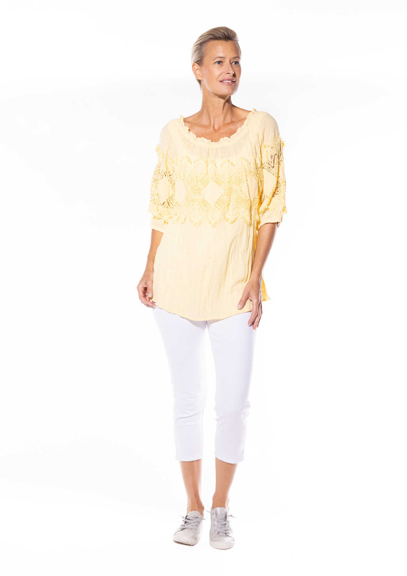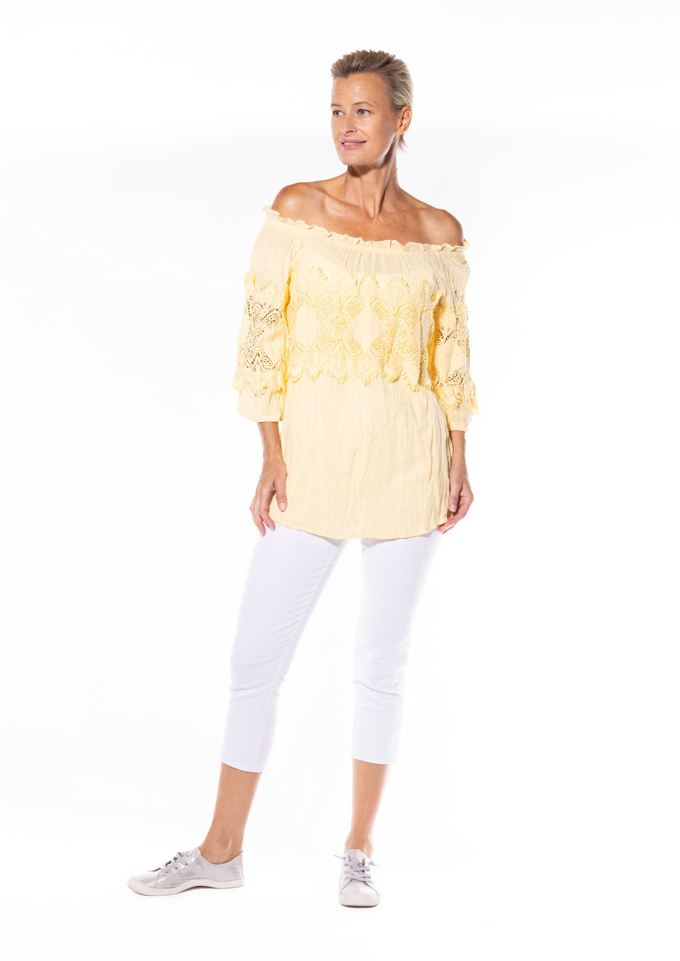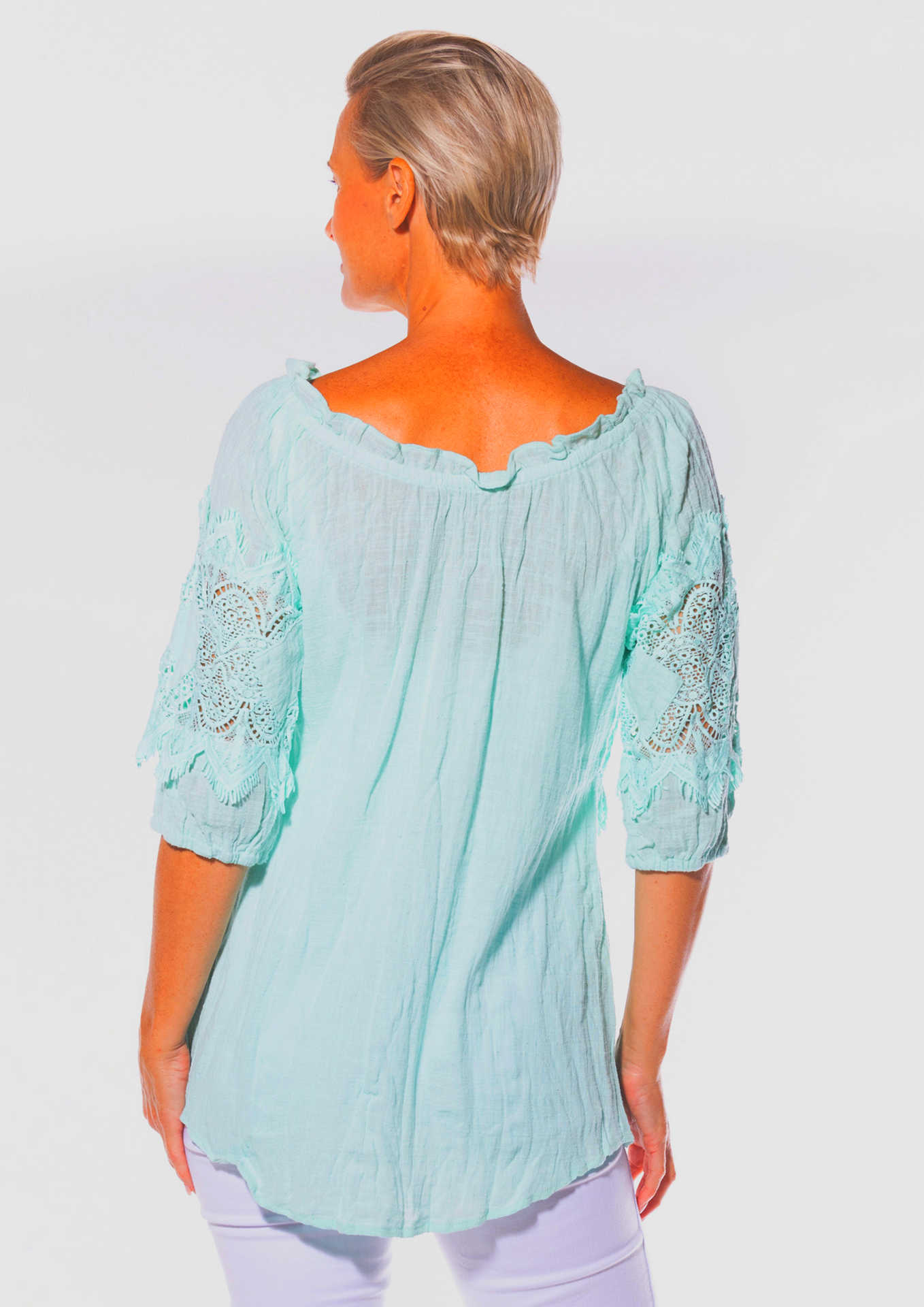 The Cafe Latte Cotton Peasant Top (CLM448) has lace trim on the elbow length sleeves, and front bodice. It has an elastic gathered scoop neck, that can be worn ON or Off the Shoulder.