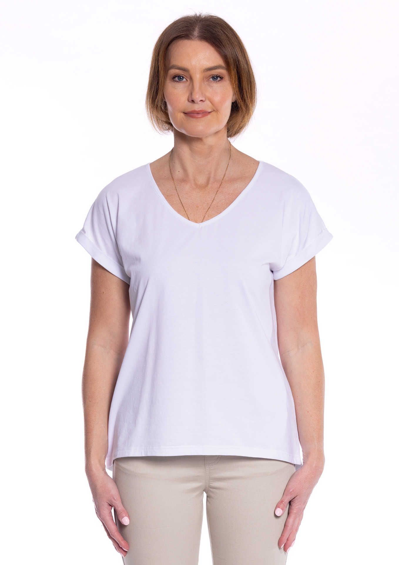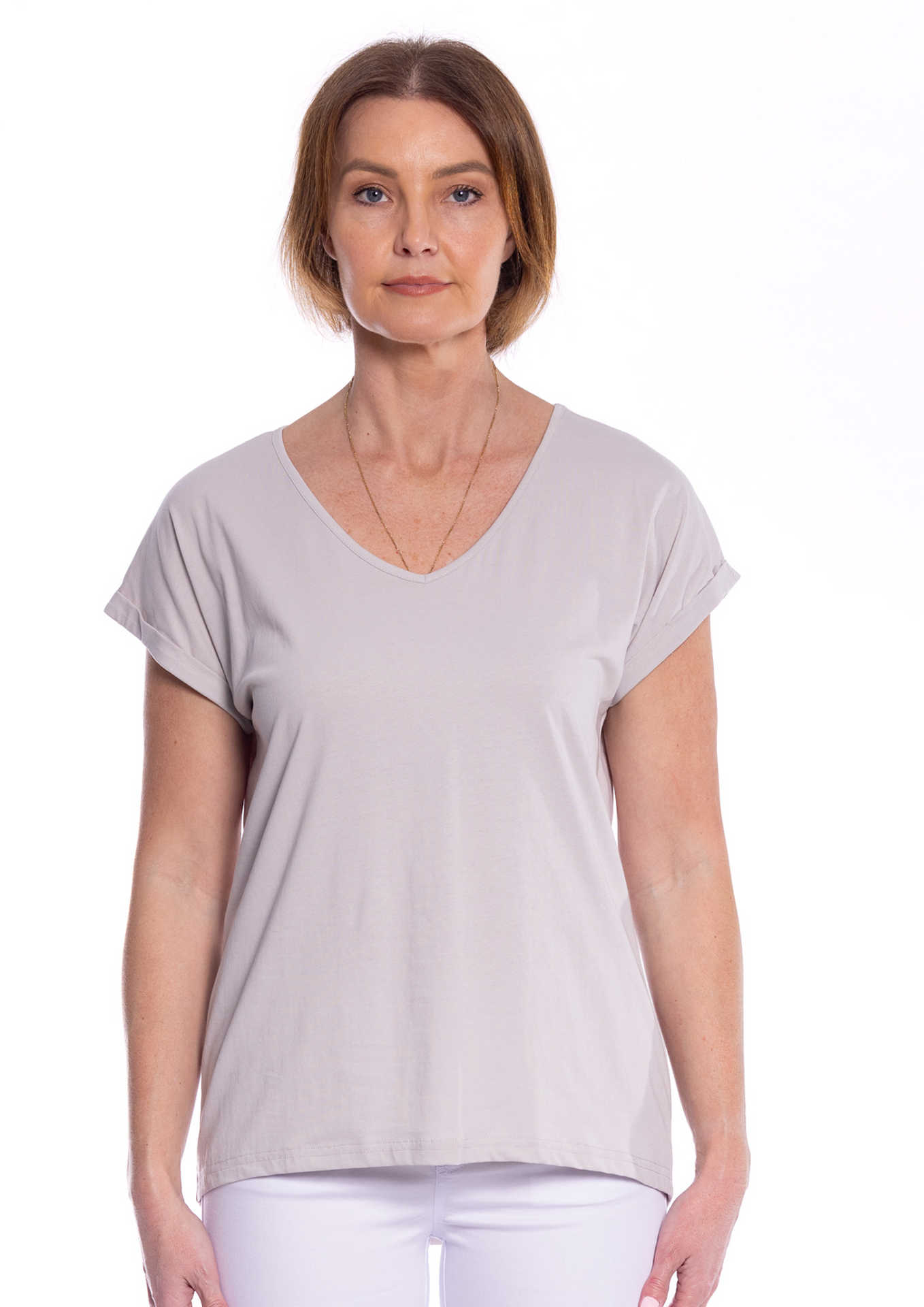CAFE LATTE V-NECK COTTON SPANDEX TEE (#CLM476)