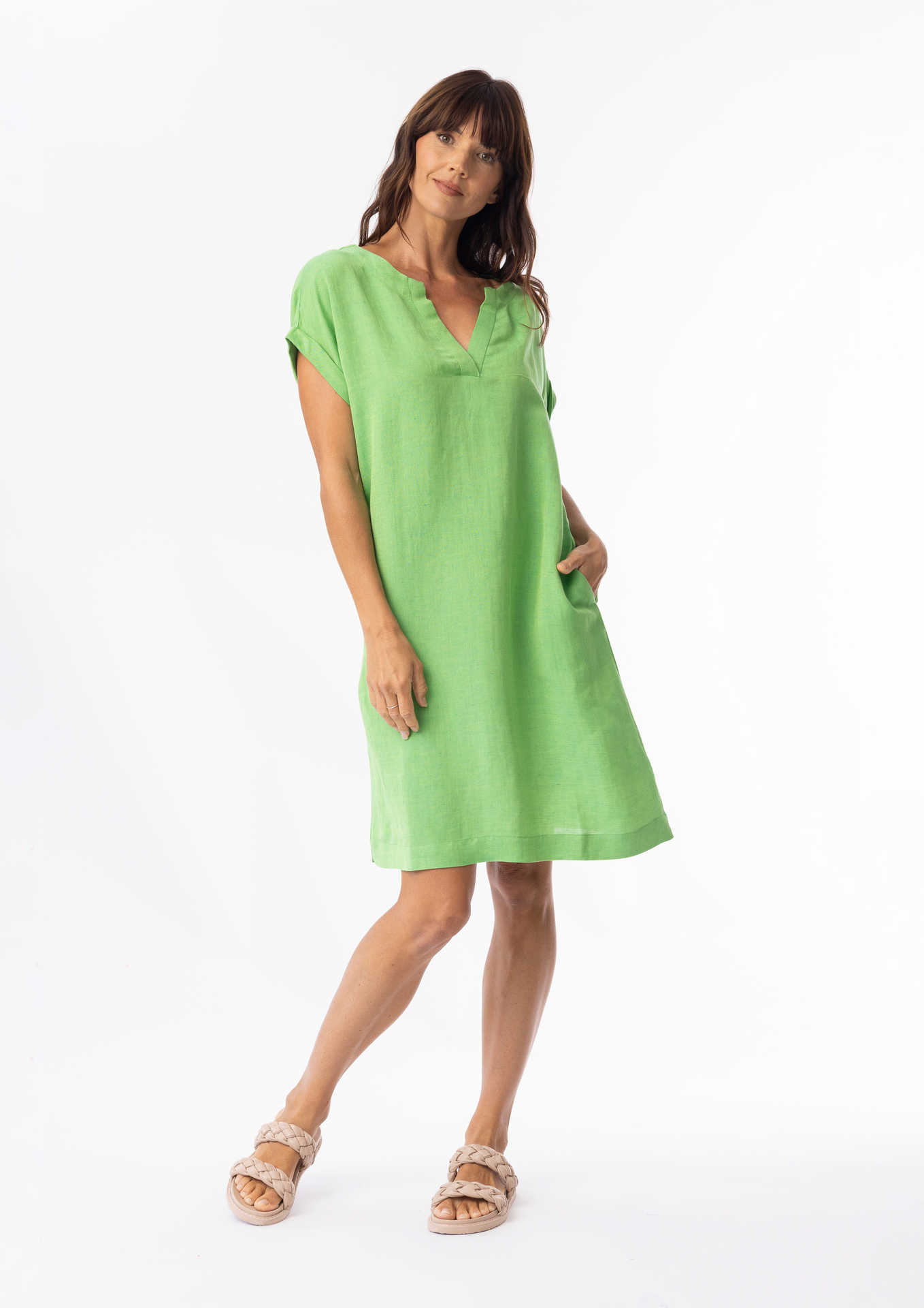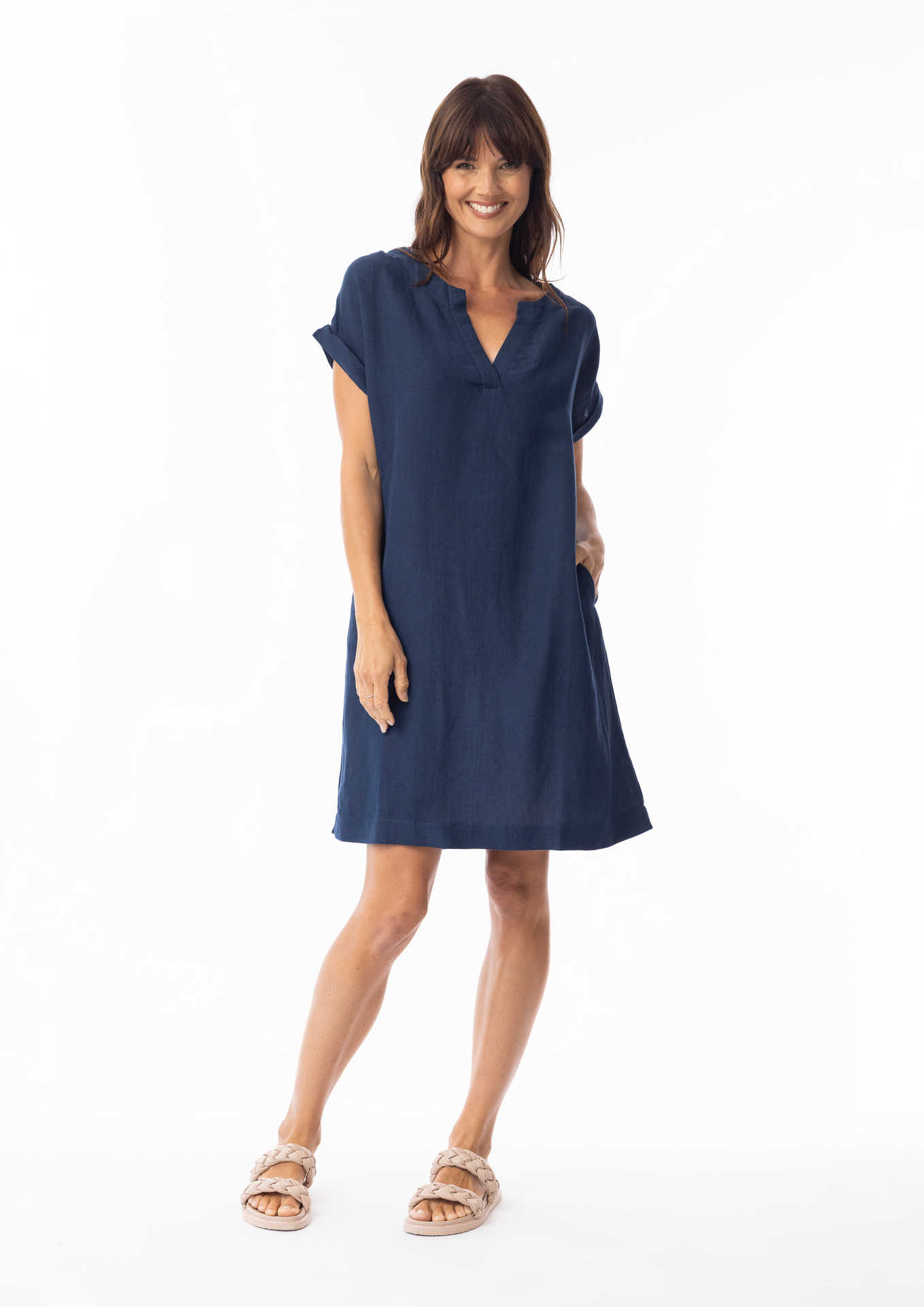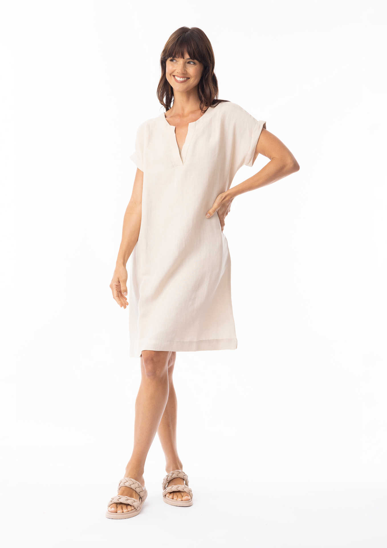 Introducing Escape by OQ's timeless Linen/Rayon Shift Dress (#71584). Crafted from a high-quality linen blend, this dress ensures breathability and comfort. Featuring a classic VNeck placket and relaxed fit, this sshift dress seamlessly blends elegance with casual chic, making it a versatile addition to your everyday wardrobe.