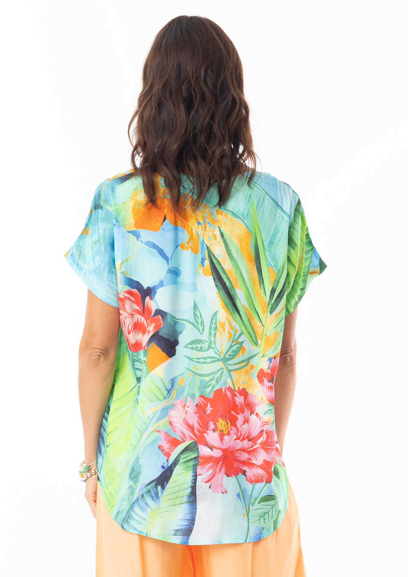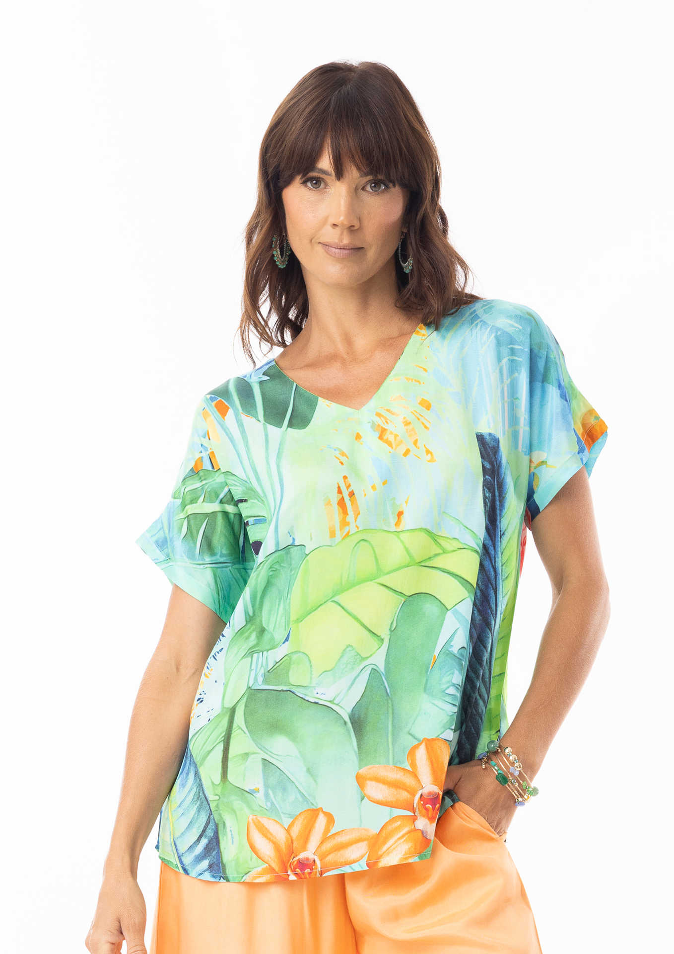 Brighten your wardrobe with our vibrant EVELIN top (#72541). Featuring a flattering V-neck and cap sleeves, this soft, breathable top is ideal for warm sunny days. The vibrant coastal inspired prints and colours easily add style and personality to any look.