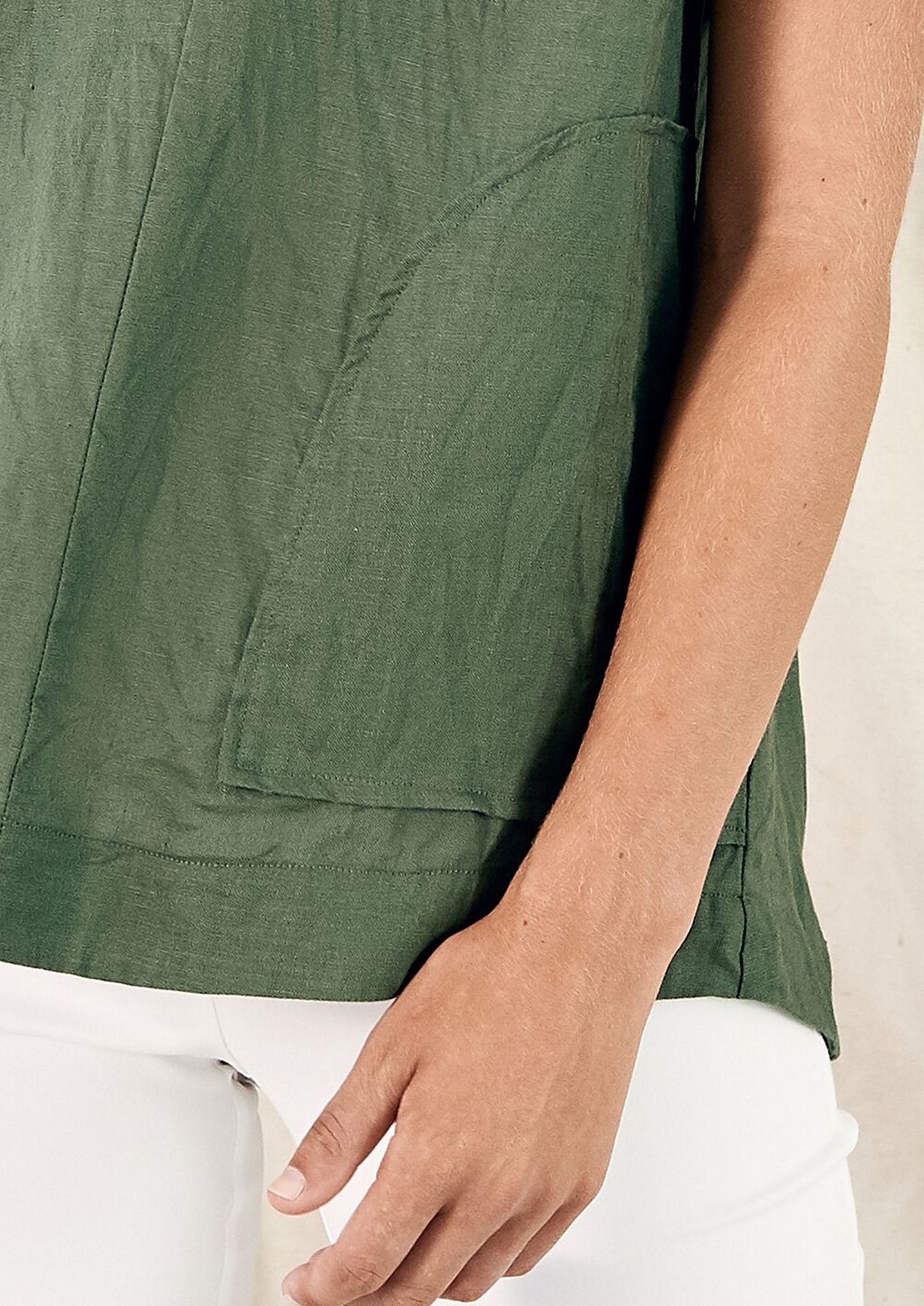 The LAYER'D MALA TOP is a cap sleeve loose fitting V-Neck top. it has large patch pocket detail and a shaped hemline.