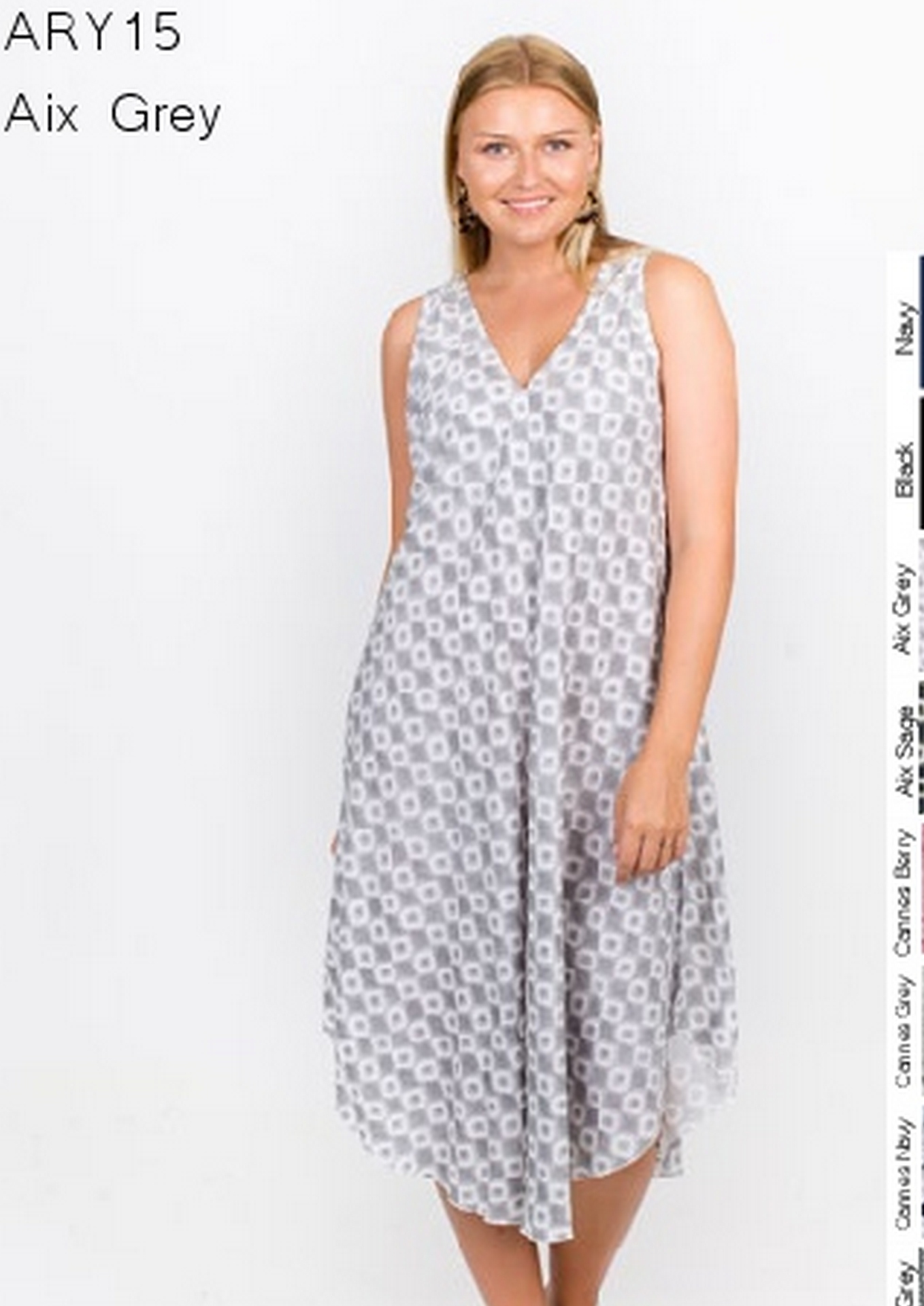 THE NAMASTAI ARY15 V-Neck DRESS IS A SLEEVELESS MID CALF LENGTH dress with  a curved hem.