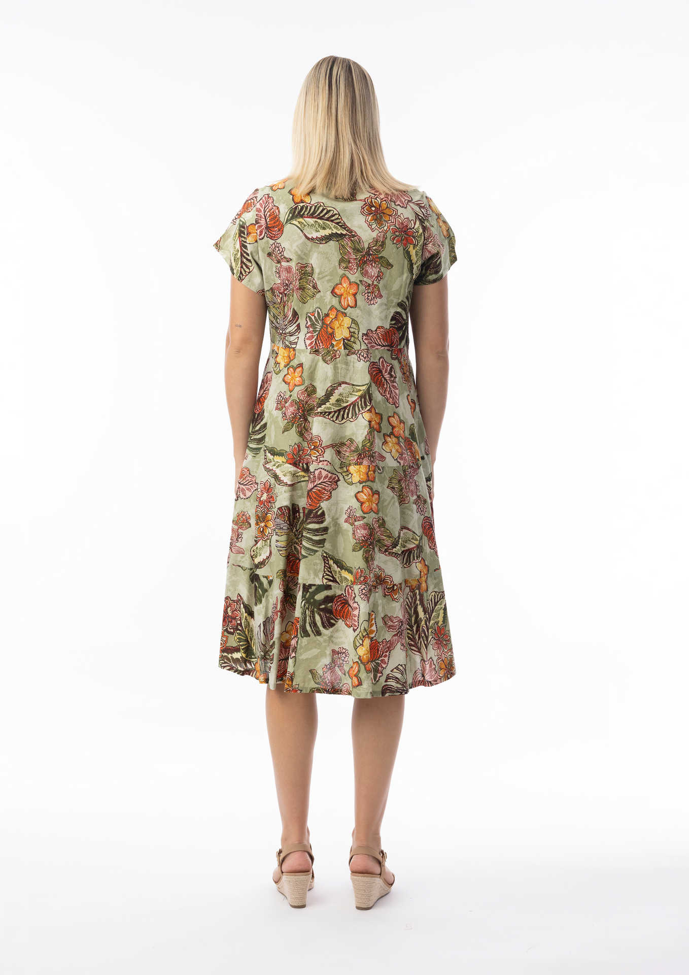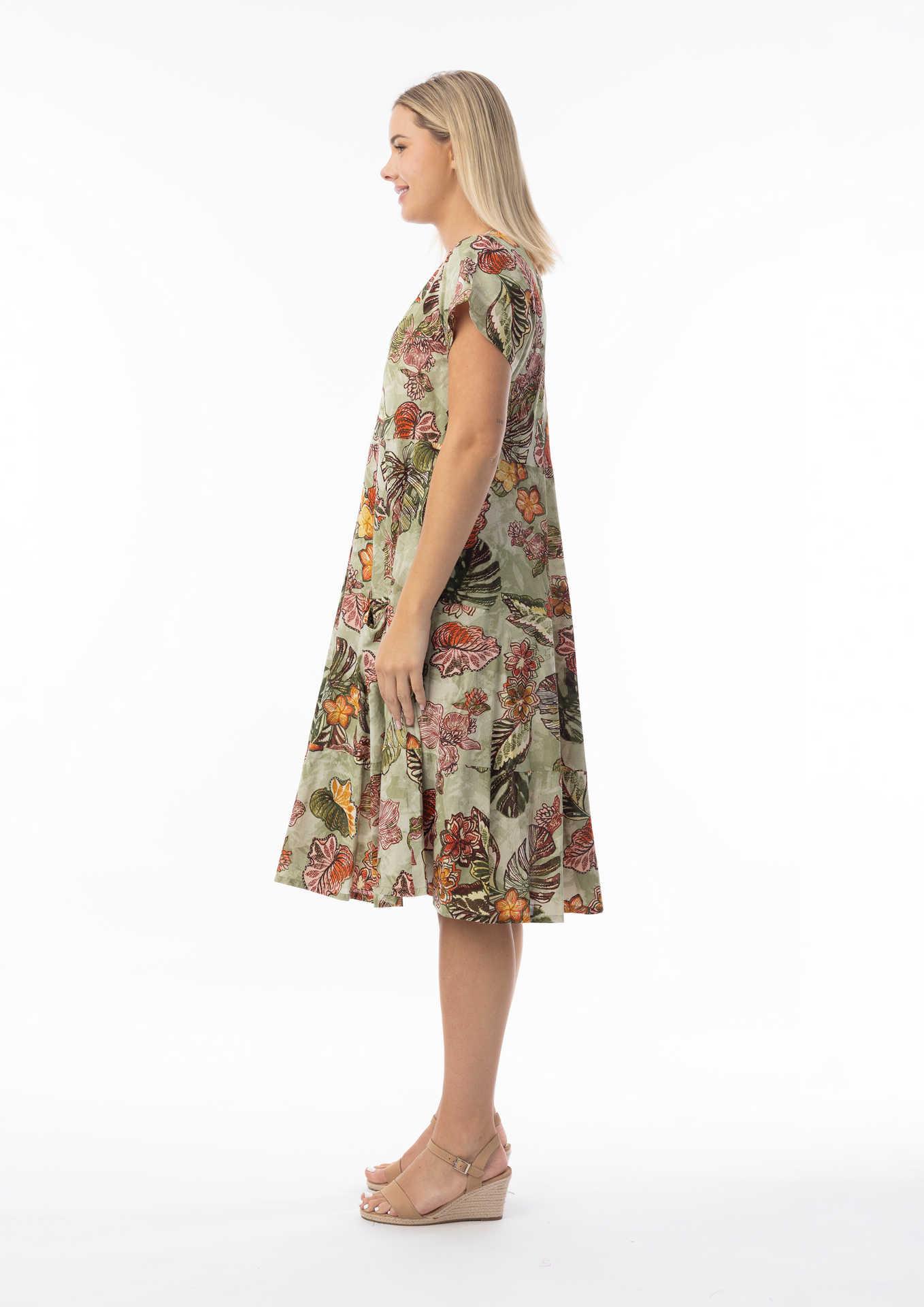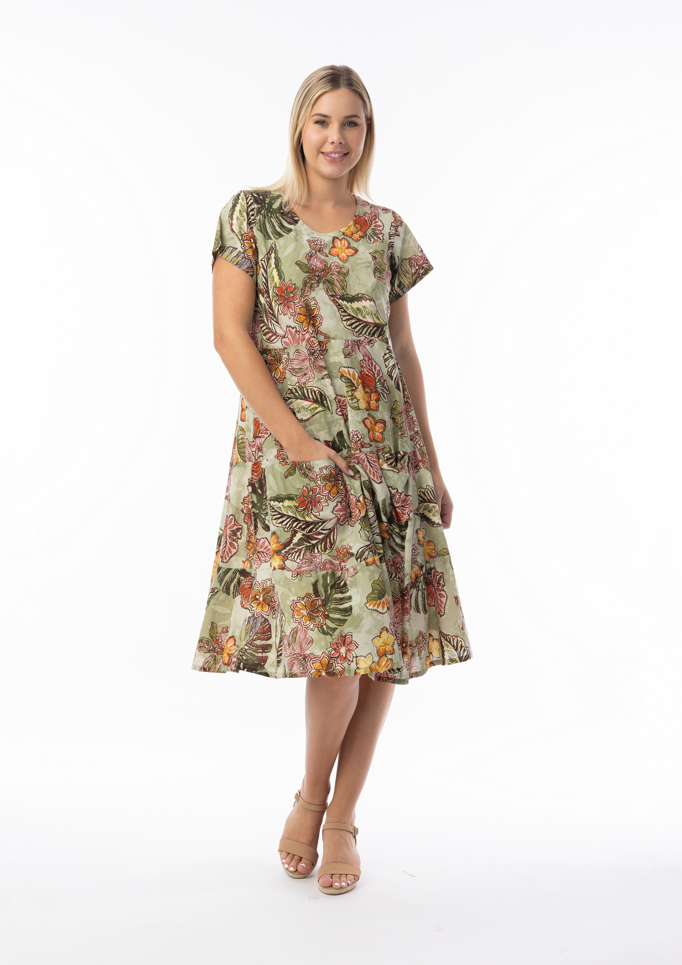 The ORIENTIQUE 'LIMA OLIVE' Print Bias Cut Layer Dress has a Scoop neck. It has a two tiered skirt falling from the bodice, and side pockets. It has a cap sleeve and is mid calf length