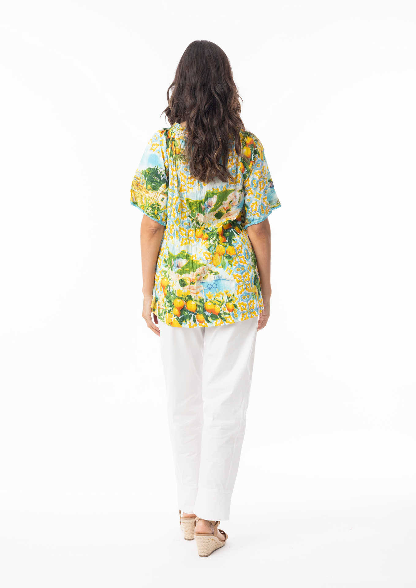 Make a statement this summer with our AMALFI boho top (#32443). This top features a relaxed fit, an open neckline with tassel details, delicate pleats at the bust, and vibrant prints. Elevate your summer wardrobe with effortless style.