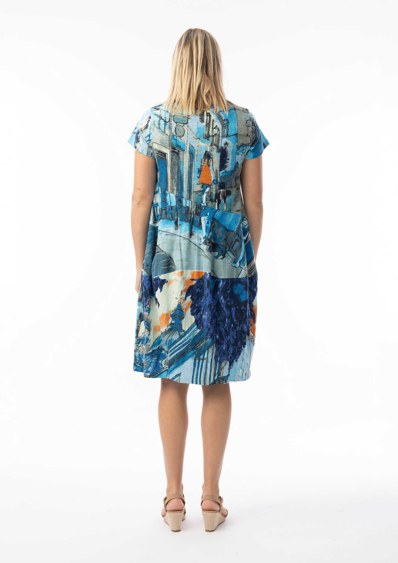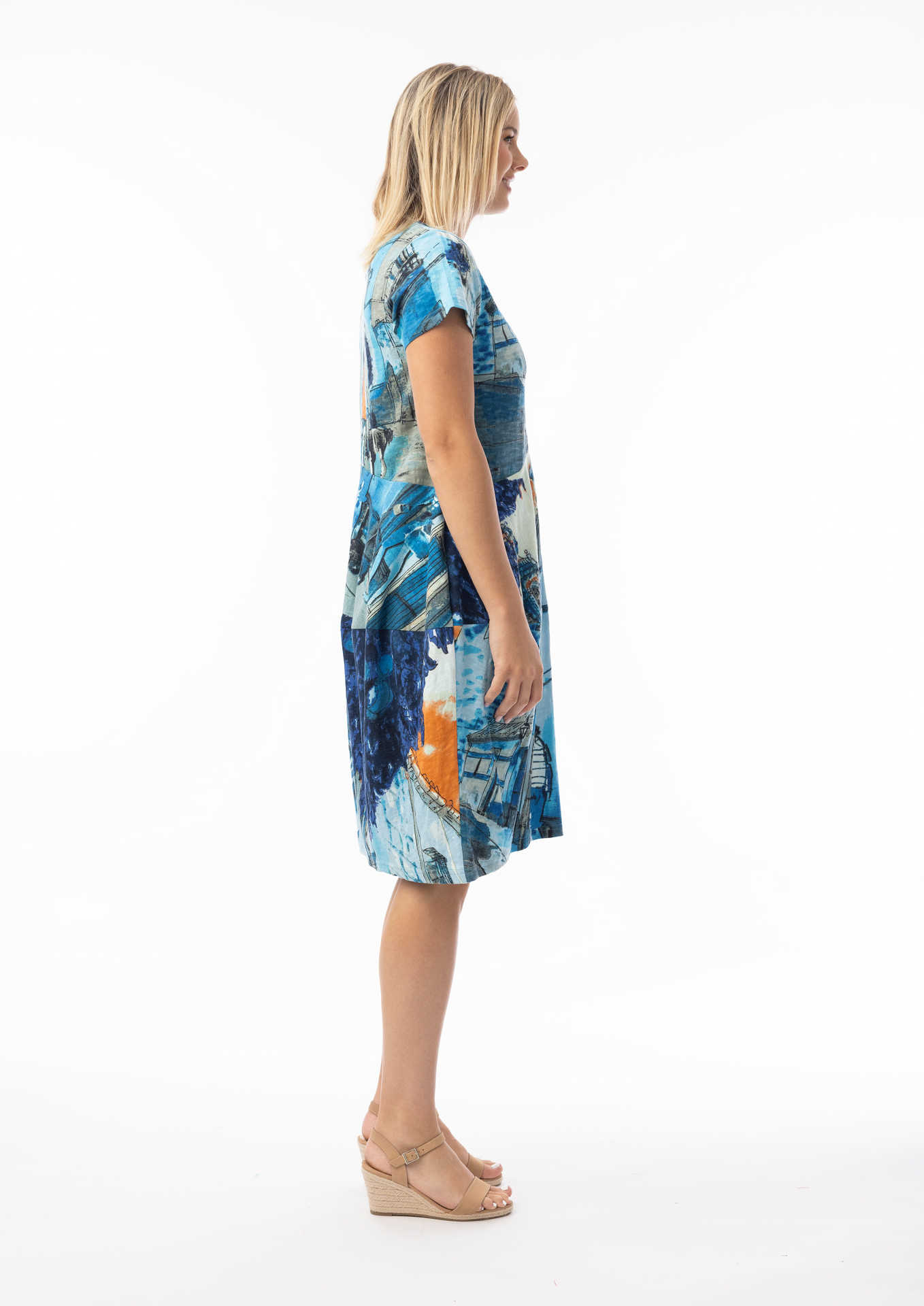Shine in Orientique's colourful TOWER BLUE print bubble dress (#20151TB). Featuring a bound scoop neckline, relaxed short sleeves, diagonal waist seam, and practical pockets, this dress showcases gorgeous colours and prints perfect for summer. Its flowing silhouette offers both comfort and style, making it ideal for beach outings and leisurely strolls. The perfect effortless summer dress!