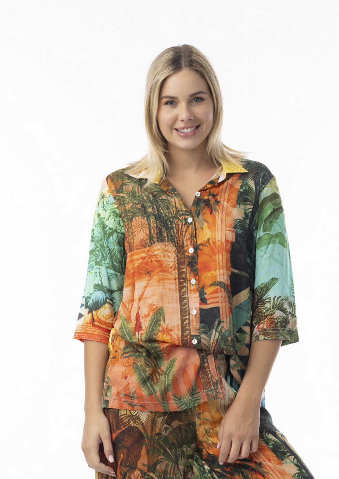 Make a statement in Orientique's  bold digital collared shirt (#72565) in Vintage Tropical print. Showcasing vibrant, eye-catching prints, this standout piece features a classic button-up front, smart collar, and chic three-quarter sleeves. Crafted from soft, silky rayon with a flattering cut, it’s the perfect blend of comfort and style—ideal for dressing up or down with ease. A must-have for adding personality to any outfit!