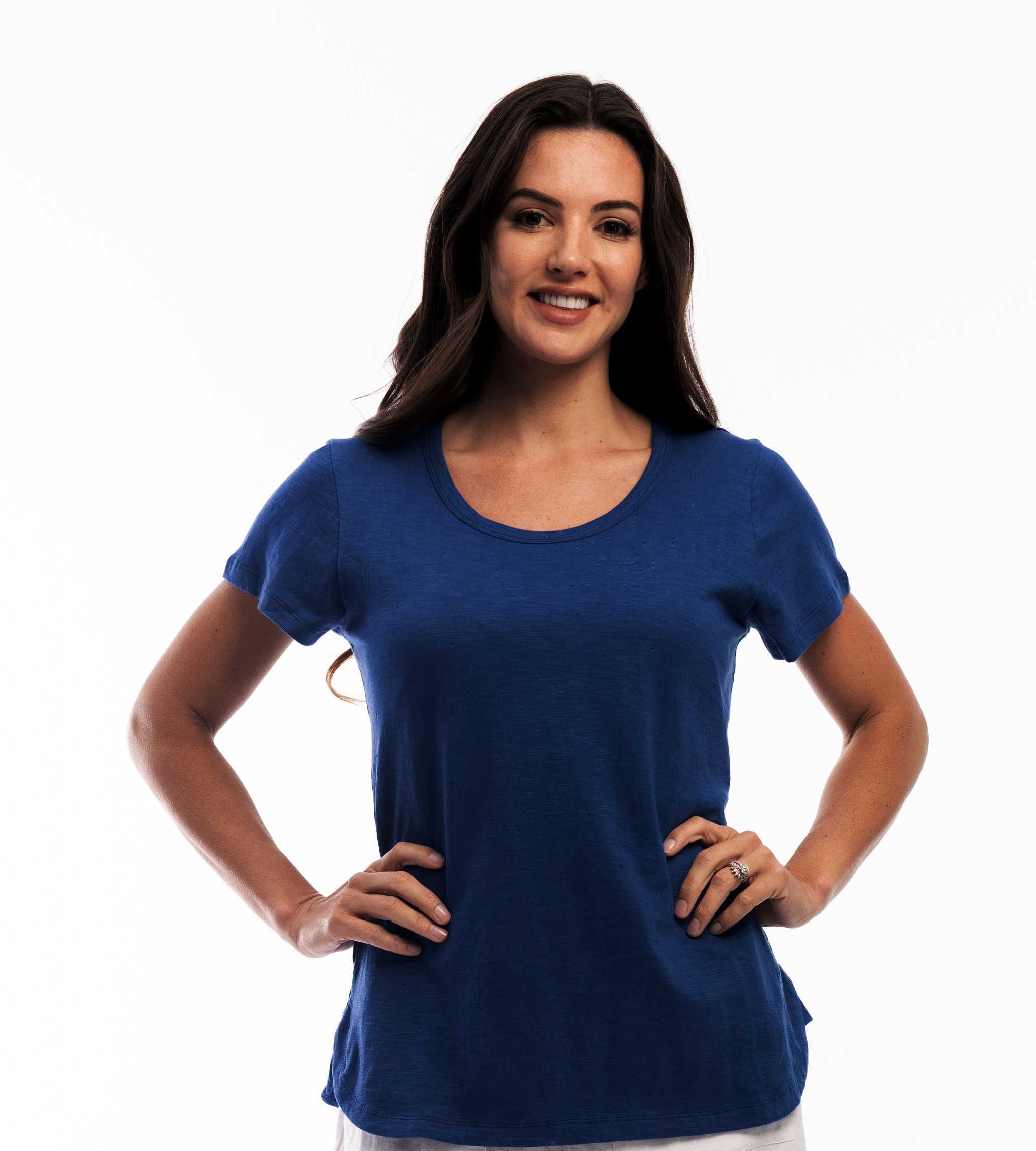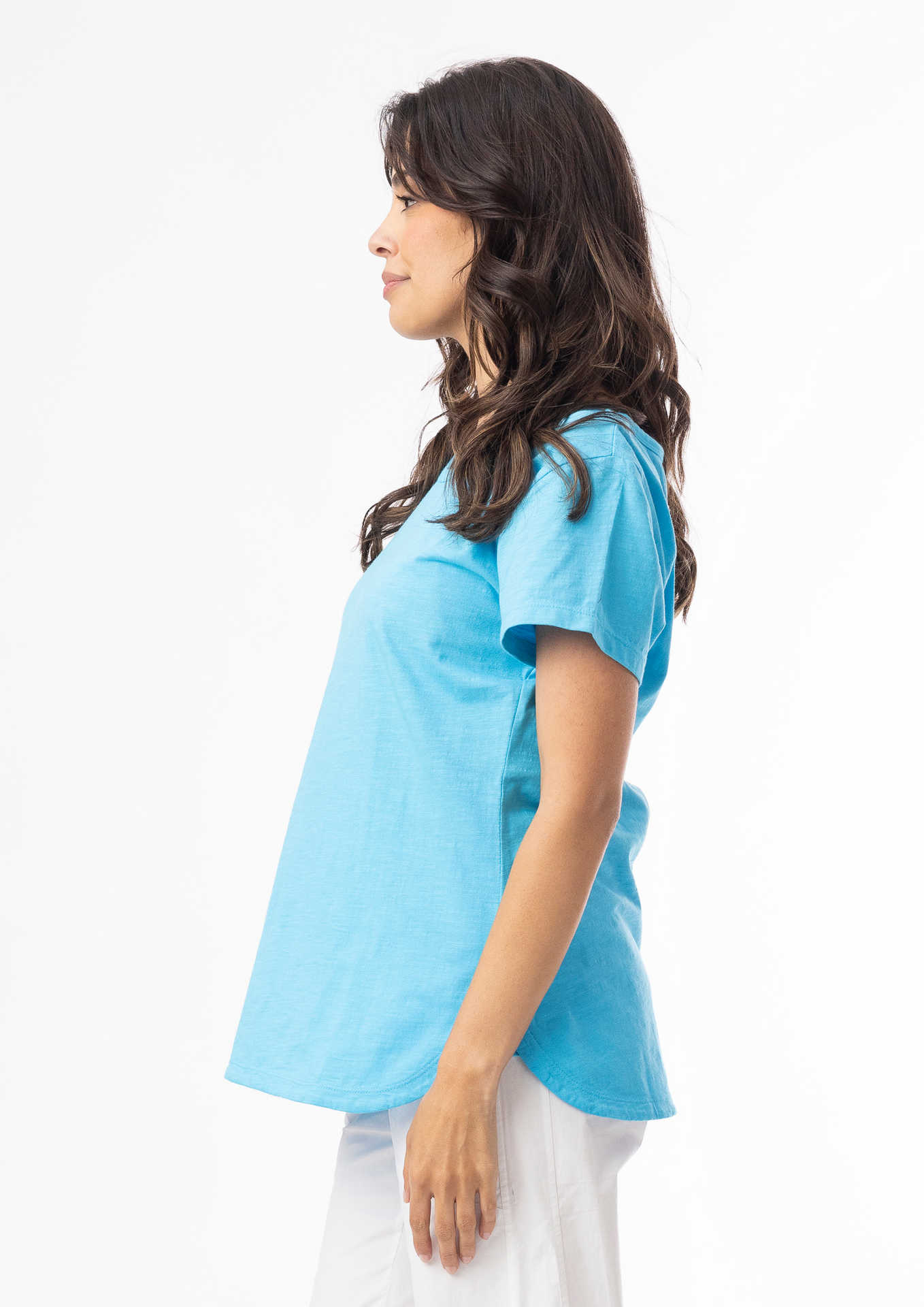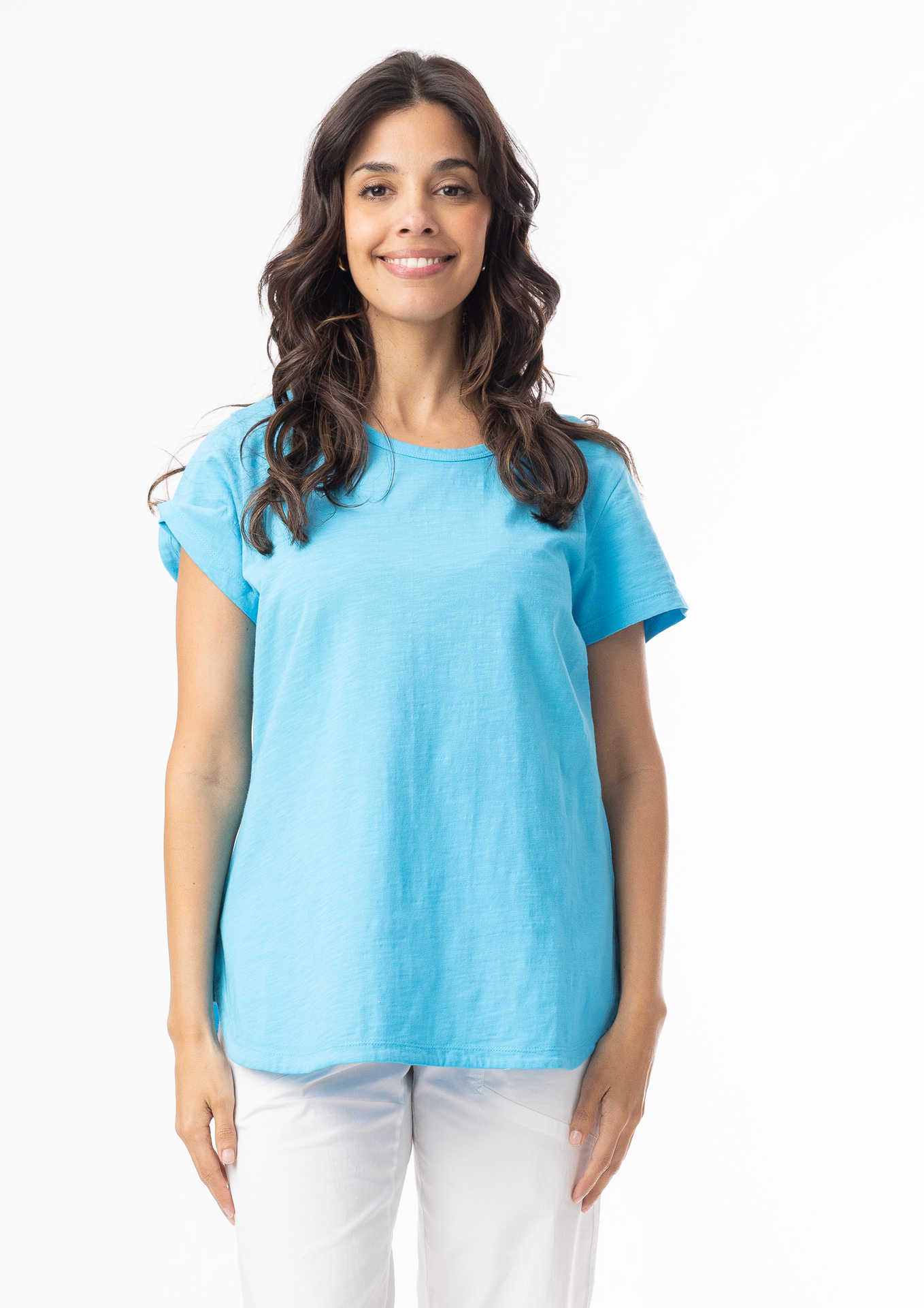 The Orientique ESSENTIALS RANGE COTTON TEE (#6207) has a SCOOP neckline, and a cap sleeve. It Falls to hip length