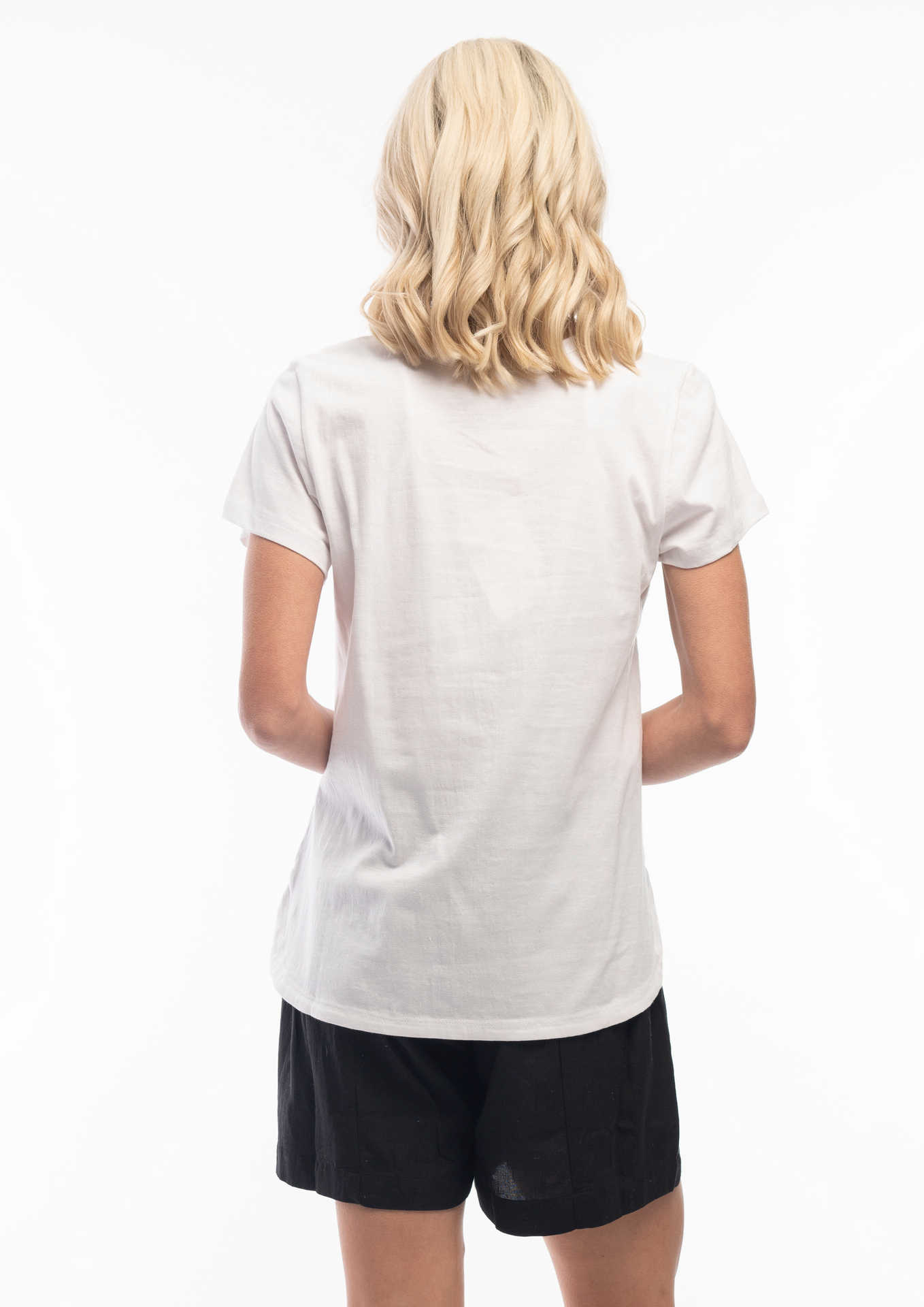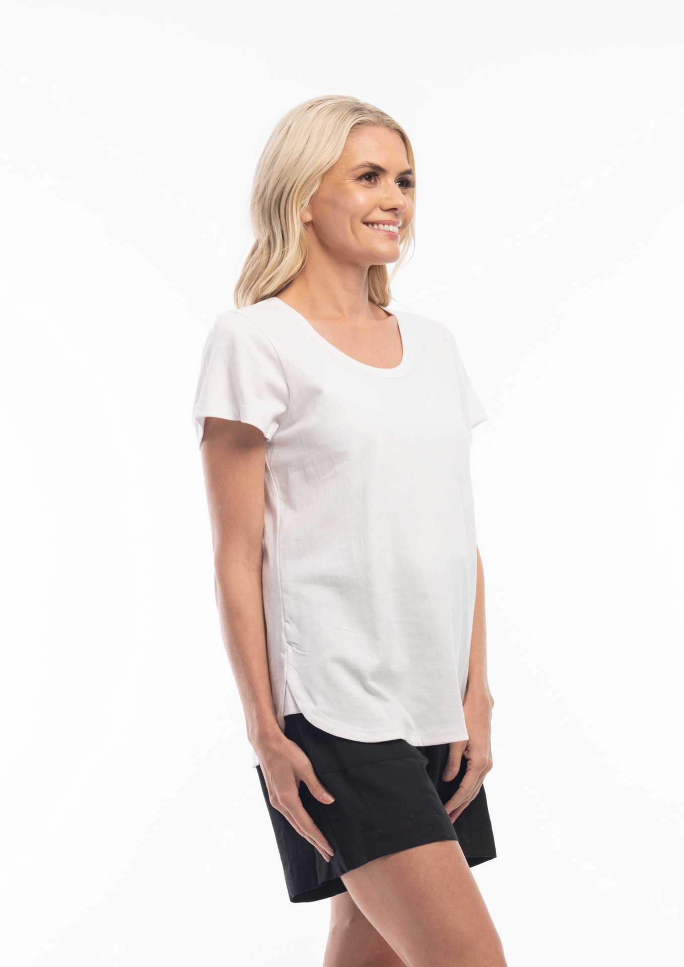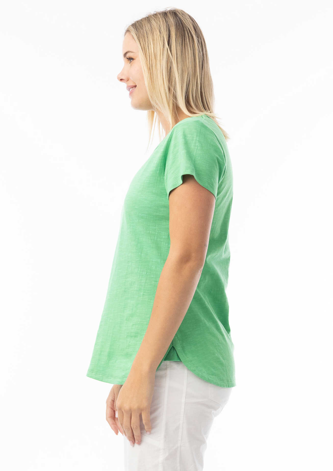 The Orientique ESSENTIALS RANGE COTTON TEE (#6207) has a SCOOP neckline, and a cap sleeve. It Falls to hip length