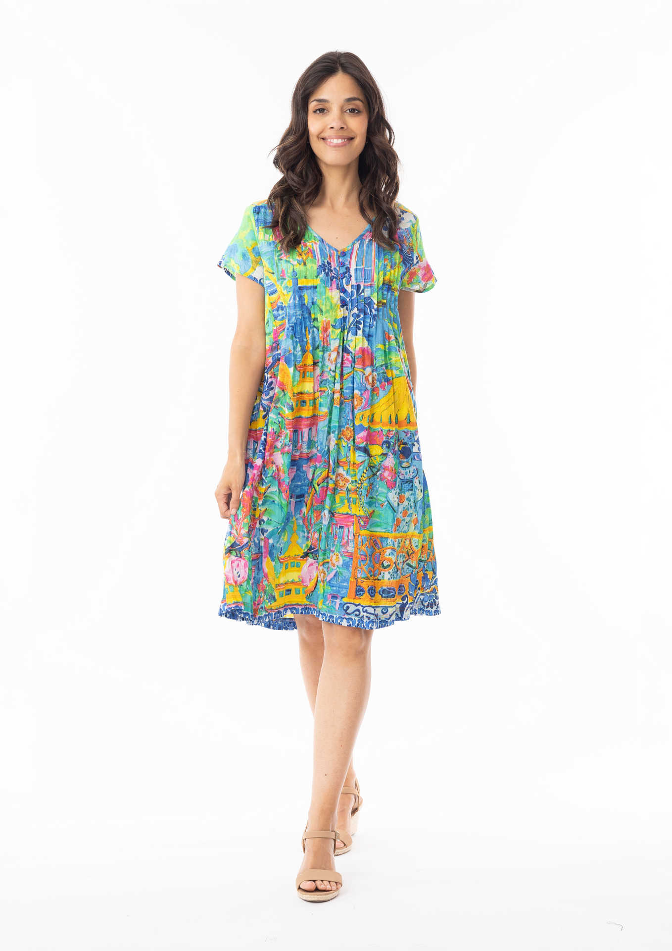This Orientique OKAYAMA Print (#40185) Ezy Fit V-Neck Dress has a cap Sleeve, side pockets, a V-neck with pintucks on the bodice and back for an easy fit.
