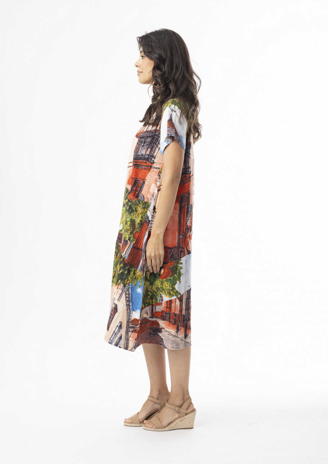 Crafted from 100% certified organic cotton in this typical European Street Scene print in the Short Sleeve Crew Neck Dress by Orientique, it will have you stepping out feeling feminine and confident, in this lovely Romantic Print. The below knee length cut and contemporary style is flattering for all body shapes and tucks away any problematic areas. Wear this and you are ready for a wonderful Summer day!