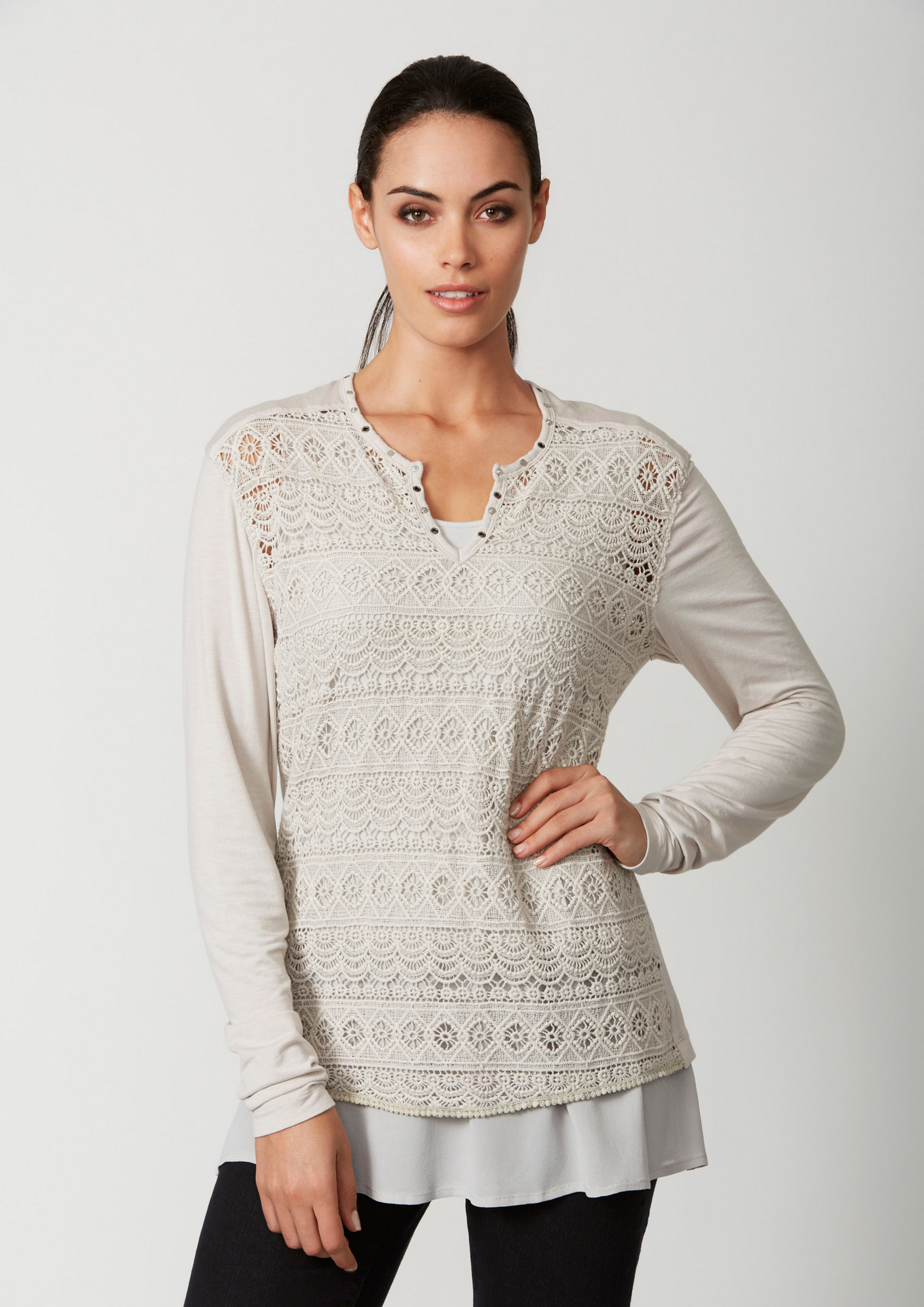The VERGE ASHMORE TOP (2813)is a V-nevk long sleeve top It has a bound neckline with stud detail and l00% cotton lace front and lace yoke at the back. The Sleeve is plain fabric.