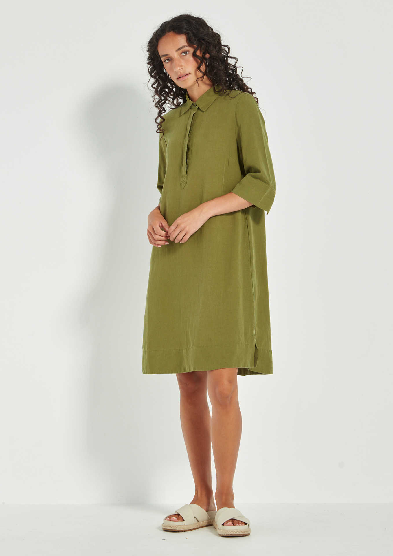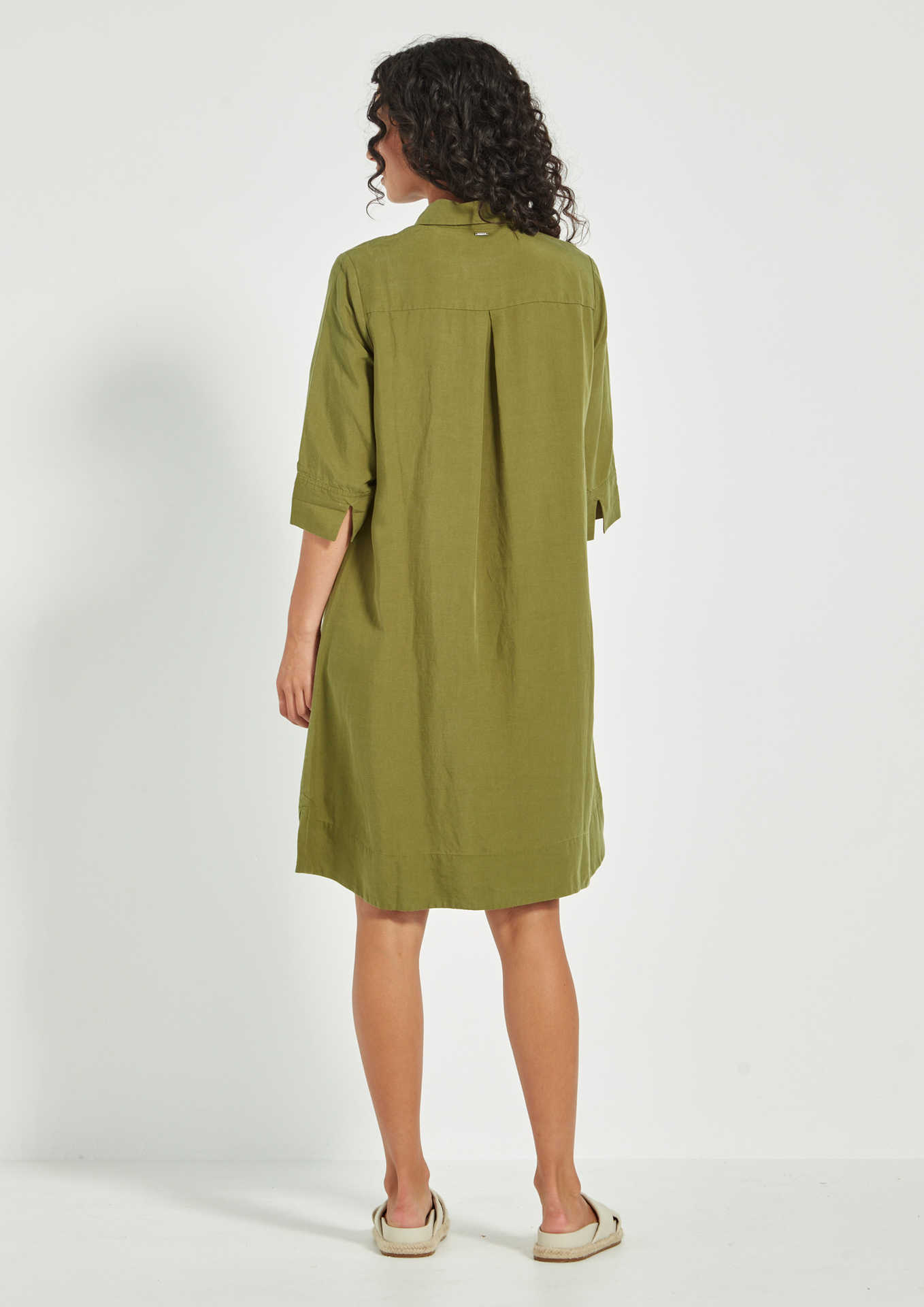 The VERGE Seville Dress (#9776) is a relaxed yet refined shift silhouette crafted from lightweight Tencel linen. It features a stand collar, a half-placket front, and elbow-length straight sleeves finished with split cuffs. An inverted pleat at the back adds ease of movement, creating a timeless design that flatters all body shapes.